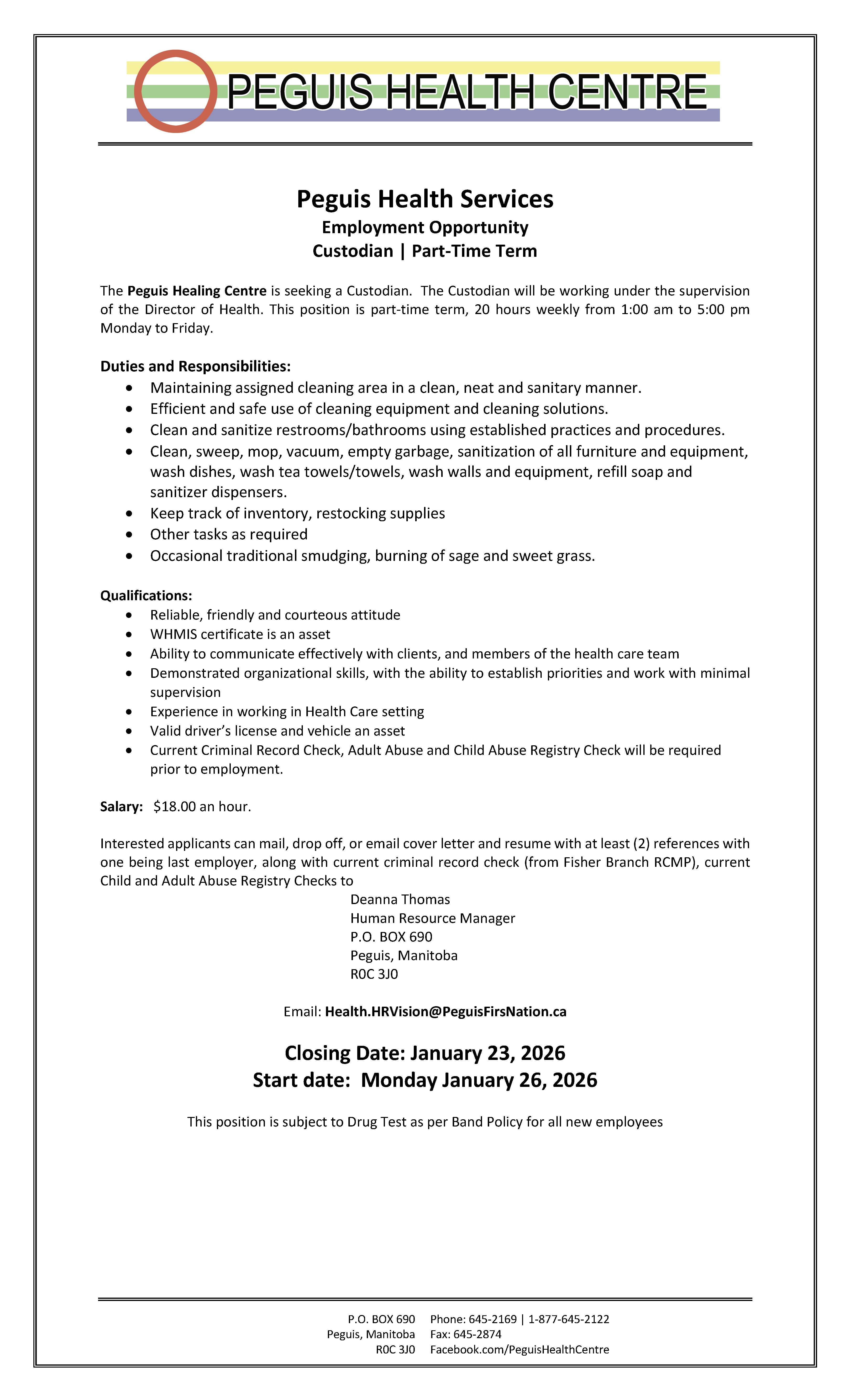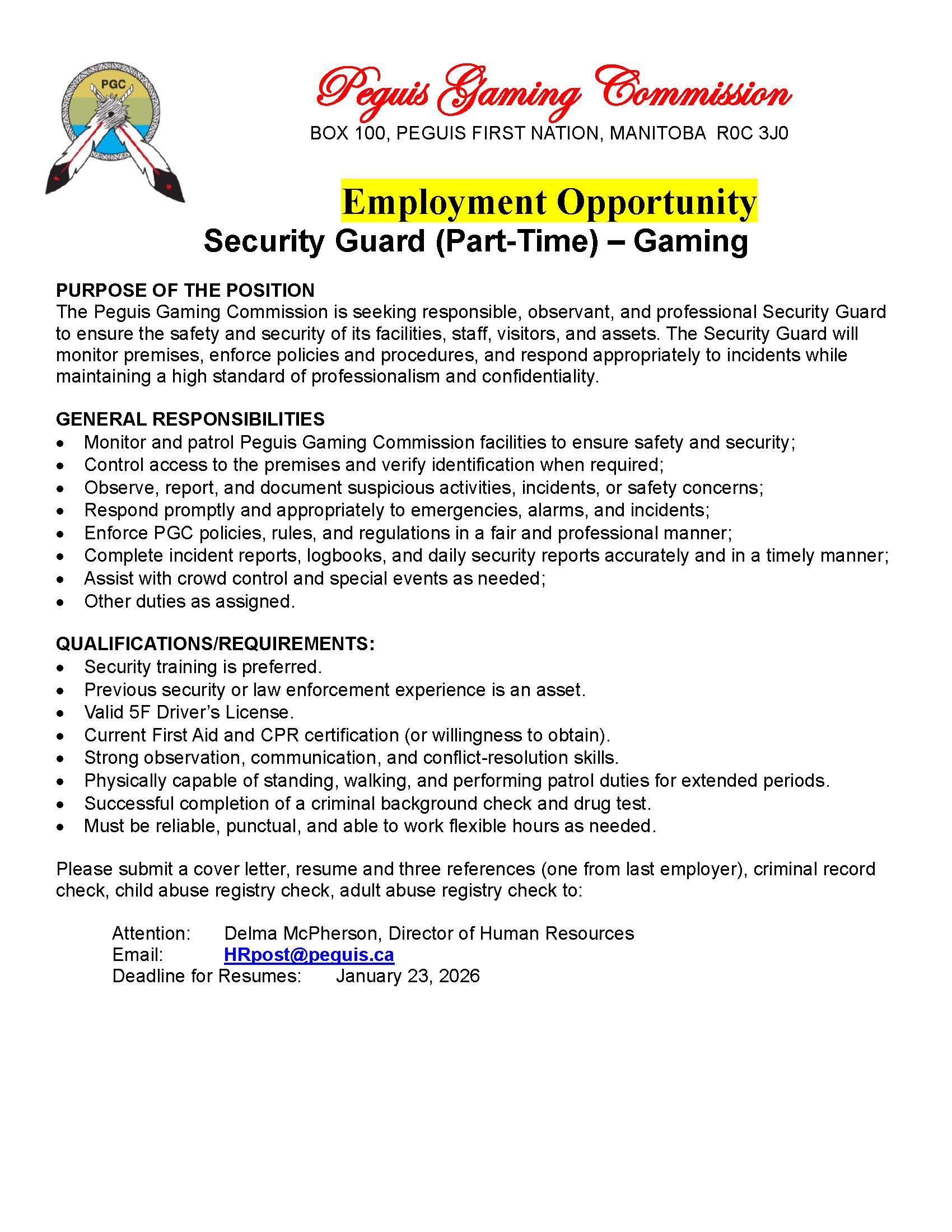 Download PDF here Return applications to: Delma McPherson, Director of Human Resources Peguis First Nation PO Box 10, Peguis Reserve, MB ROC 3J0 Email: HRpost@peguis.ca