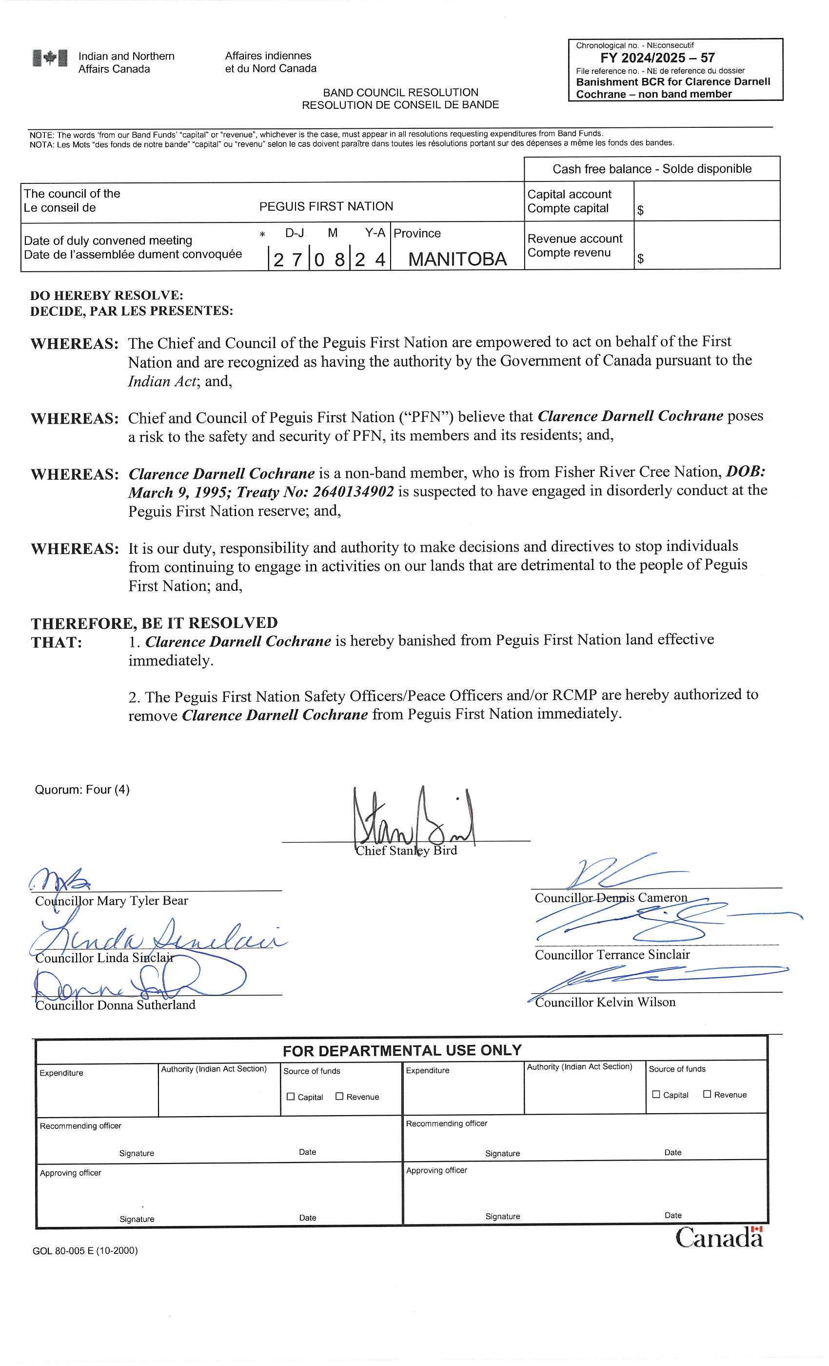 Band Council Resolution - Clarence Darnell Cochrane