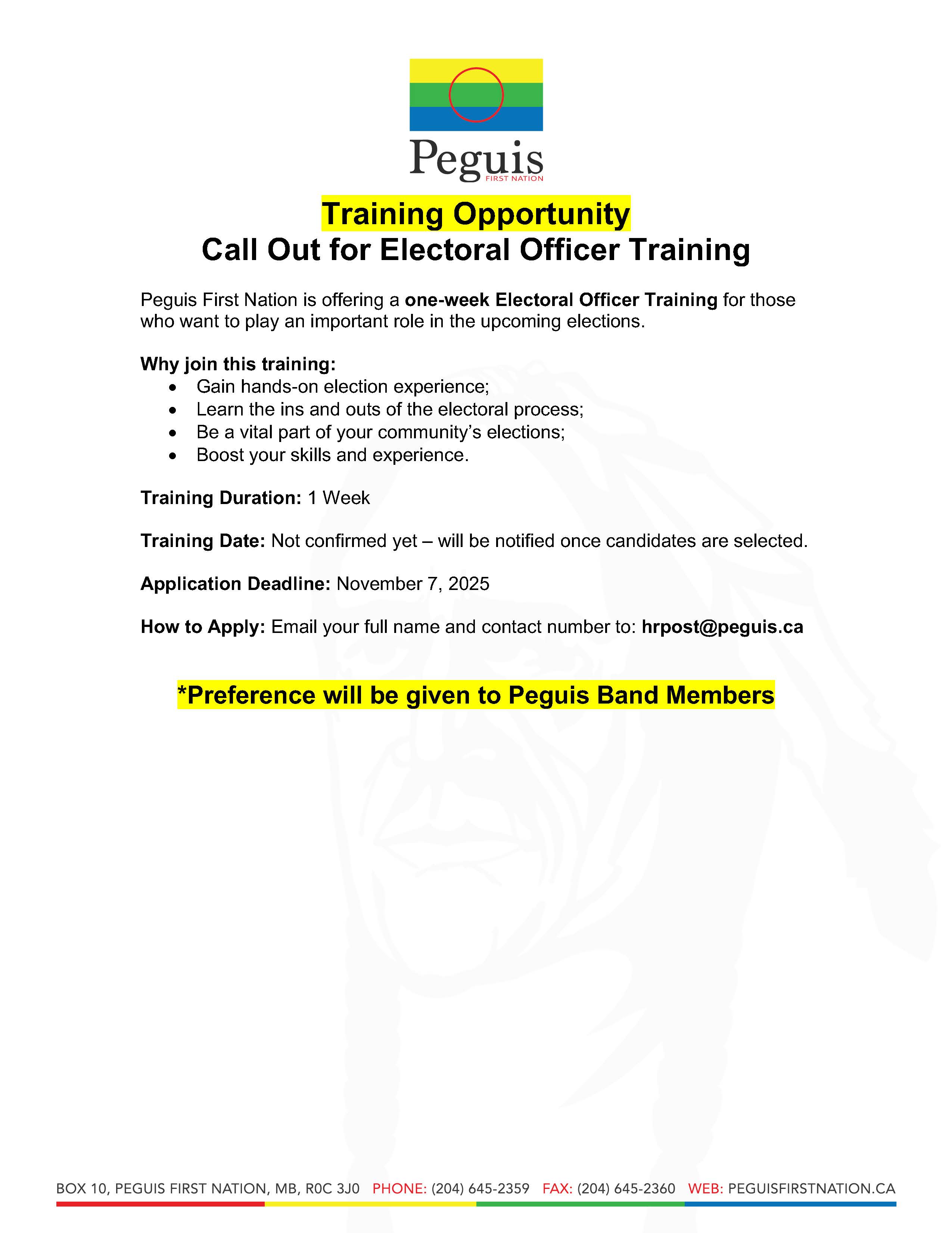 Opportunities WINTERIZATION PROJECT WORKERS Instructor Required On Call/Intake Worker (Part-time Position) Medical Navigator – Full-time Term Position Jordan’s Principle Department Location: Peguis Land Base Support Worker – Full-time Term Position Jordan’s Principle Department Location: Winnipeg Child Development Worker– Full-time Term Position Jordan’s Principle Department Location: Peguis Child Development Worker – Full-time Term Position Jordan’s Principle Department Location: Winnipeg Case Manager – Full-time Term Position Jordan’s Principle Department Location: Winnipeg Catering for Annual Employee Dinner on December 5th 2025 Community Computer Resource Centre Coordinator Receptionist (Full-time Term) Position Peguis Band Office Yard Operator (Full-time Term Position) Housing Department Haulers – 2 Positions (Part-time) Housing Department Safety Officer/Human Resources Officer (Full-time Term Position) Housing Department Administrative Assistant - Chief Peguis Investment Corp. Peguis Mall - Sidewalk Project Urban Outreach Coordinator -Term Position Licensed Practical Nurse – 3 Month Term Early years teacher required Septic Truck Driver (2-Term Positions)