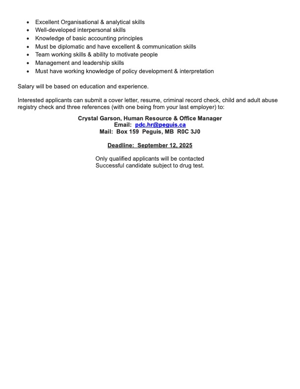 Opportunities Septic Truck Driver (2-Term Positions) Call out for Trust Nominating Committee Member Middle Years Teacher Required Board & Committee Members General Manager - Peguis Development Corporation General Labourers (10) – Term Position Safety Officer Training Level 1 Security Guard (Full-time) – Peguis Mall School Nurse / Health Care Aide PCS 2025-2026 Licensed Practical Nurse (LPN) Full time Position Director of Nursing Summer Employment Program Checklist Finance Clerk - Oodena Gas & Convenience Vice Principal - Peguis School Board Teachers - Peguis School Board Health Care Aide (HCA) - Peguis Senior Centre Licensed Practical Nurse (LPN) Full time Position - Peguis Senior Centre Dietary Aide - Peguis Senior Centre Housekeeping and Laundry Aide - Peguis Senior Centre Educational Assistant