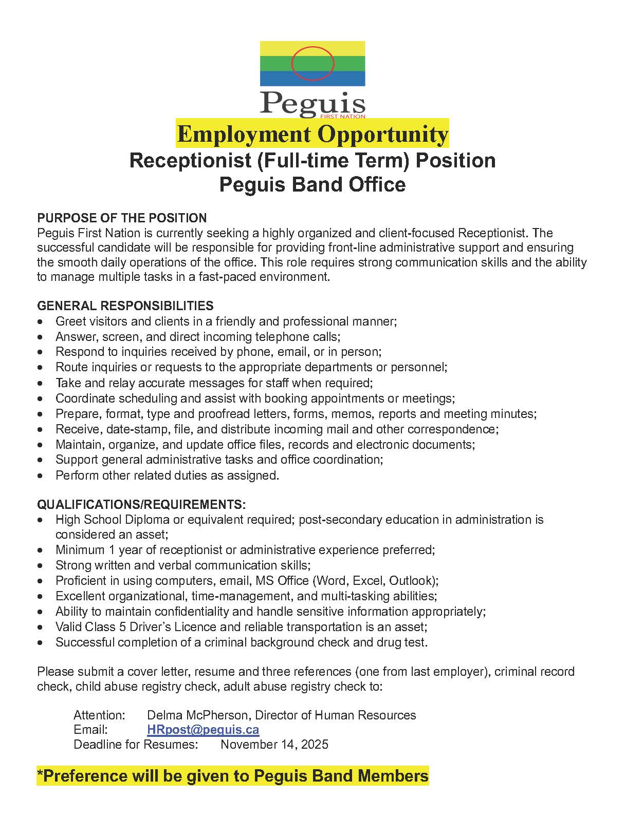 Opportunities WINTERIZATION PROJECT WORKERS Instructor Required On Call/Intake Worker (Part-time Position) Medical Navigator – Full-time Term Position Jordan’s Principle Department Location: Peguis Land Base Support Worker – Full-time Term Position Jordan’s Principle Department Location: Winnipeg Child Development Worker– Full-time Term Position Jordan’s Principle Department Location: Peguis Child Development Worker – Full-time Term Position Jordan’s Principle Department Location: Winnipeg Case Manager – Full-time Term Position Jordan’s Principle Department Location: Winnipeg Catering for Annual Employee Dinner on December 5th 2025 Community Computer Resource Centre Coordinator Call Out for Electoral Officer Training Yard Operator (Full-time Term Position) Housing Department Haulers – 2 Positions (Part-time) Housing Department Safety Officer/Human Resources Officer (Full-time Term Position) Housing Department Administrative Assistant - Chief Peguis Investment Corp. Peguis Mall - Sidewalk Project Urban Outreach Coordinator -Term Position Licensed Practical Nurse – 3 Month Term Early years teacher required Septic Truck Driver (2-Term Positions)