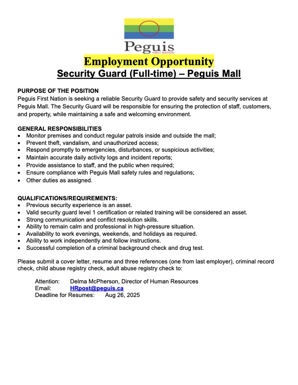 Opportunities Septic Truck Driver (2-Term Positions) FINANCE DIRECTOR – PEGUIS FIRST NATION (Full-Time Term Position) Call out for Trust Nominating Committee Member Middle Years Teacher Required Board & Committee Members General Manager - Peguis Development Corporation General Labourers (10) – Term Position Safety Officer Training Level 1 School Nurse / Health Care Aide PCS 2025-2026 Licensed Practical Nurse (LPN) Full time Position Director of Nursing Summer Employment Program Checklist Finance Clerk - Oodena Gas & Convenience Vice Principal - Peguis School Board Teachers - Peguis School Board Health Care Aide (HCA) - Peguis Senior Centre Licensed Practical Nurse (LPN) Full time Position - Peguis Senior Centre Dietary Aide - Peguis Senior Centre Housekeeping and Laundry Aide - Peguis Senior Centre Educational Assistant
